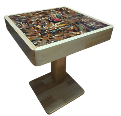 Its top features a signature mosaic pattern that highlights the natural beauty of upcycled materials, while the solid wood frame provides strength and warmth for both indoor and outdoor use.
